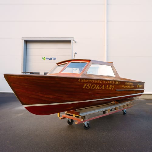 Kun vene saapui varastollemme Järvenpäähän, sen pinta kertoi tarinaa vuosikymmenten tuulista ja aalloista. Ammattitaitoisten käsien ja asiantuntevien menetelmien avulla puuvene kunnostettiin takaisin alkuperäiseen loistoonsa.